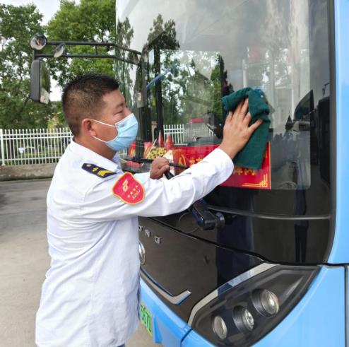 在淮海文博園公交樞紐站內,81路駕駛員謝新建正在車廂內消毒,中午的車場經過烈日炙烤,地表溫度有50多度,為了能給乘客提供一個舒適、安全的乘車環(huán)境,謝新建每班發(fā)車前都會提前上車檢查車輛設施設備、將車廂內外打掃干凈,提前打開空調,身上衣服濕了又干、干了又濕······