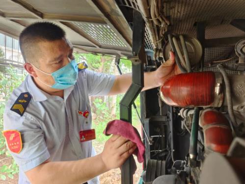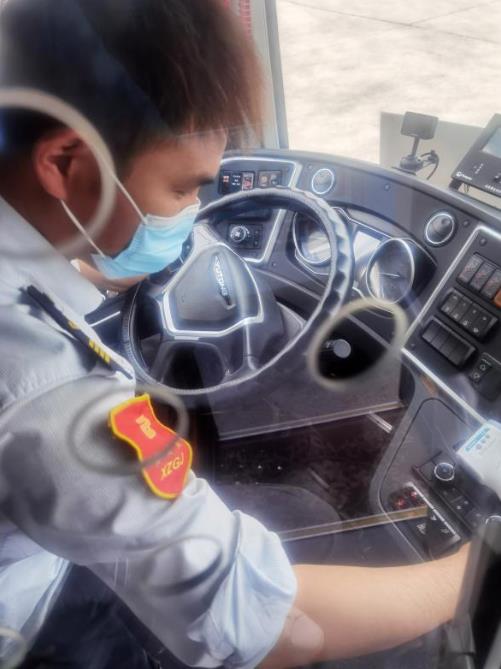新區(qū)公司1780車駕駛員白延奇駕駛的19路線,由銅山新區(qū)總站發(fā)往徐州火車站,全程接近30.5公里,途徑居民區(qū)、學(xué)校眾多,每天要跑3趟,6個(gè)單程,不堵車的時(shí)候一個(gè)單程需要一個(gè)小時(shí)。“由于工作的特殊性,即便天氣再熱我們也不敢多喝水,早晚高峰堵車至少得1個(gè)多小時(shí)才能回到主站,只有到終點(diǎn)站才能多喝幾口水,抓緊時(shí)間上個(gè)廁所。”駕駛員白延奇這樣說道。為了給市民乘客提供溫馨、舒適的車廂環(huán)境,每天朝陽(yáng)還未升起,白延奇就到達(dá)停車場(chǎng),檢查車輛狀況、擦拭發(fā)動(dòng)機(jī)、刷洗輪胎、打掃車輛衛(wèi)生,在確保“五凈一亮”的同時(shí),對(duì)車廂進(jìn)行全面消毒,不一會(huì),白延奇的額頭就布滿了汗珠,身上的行業(yè)服早已濕透,緊緊地貼在皮膚上。
