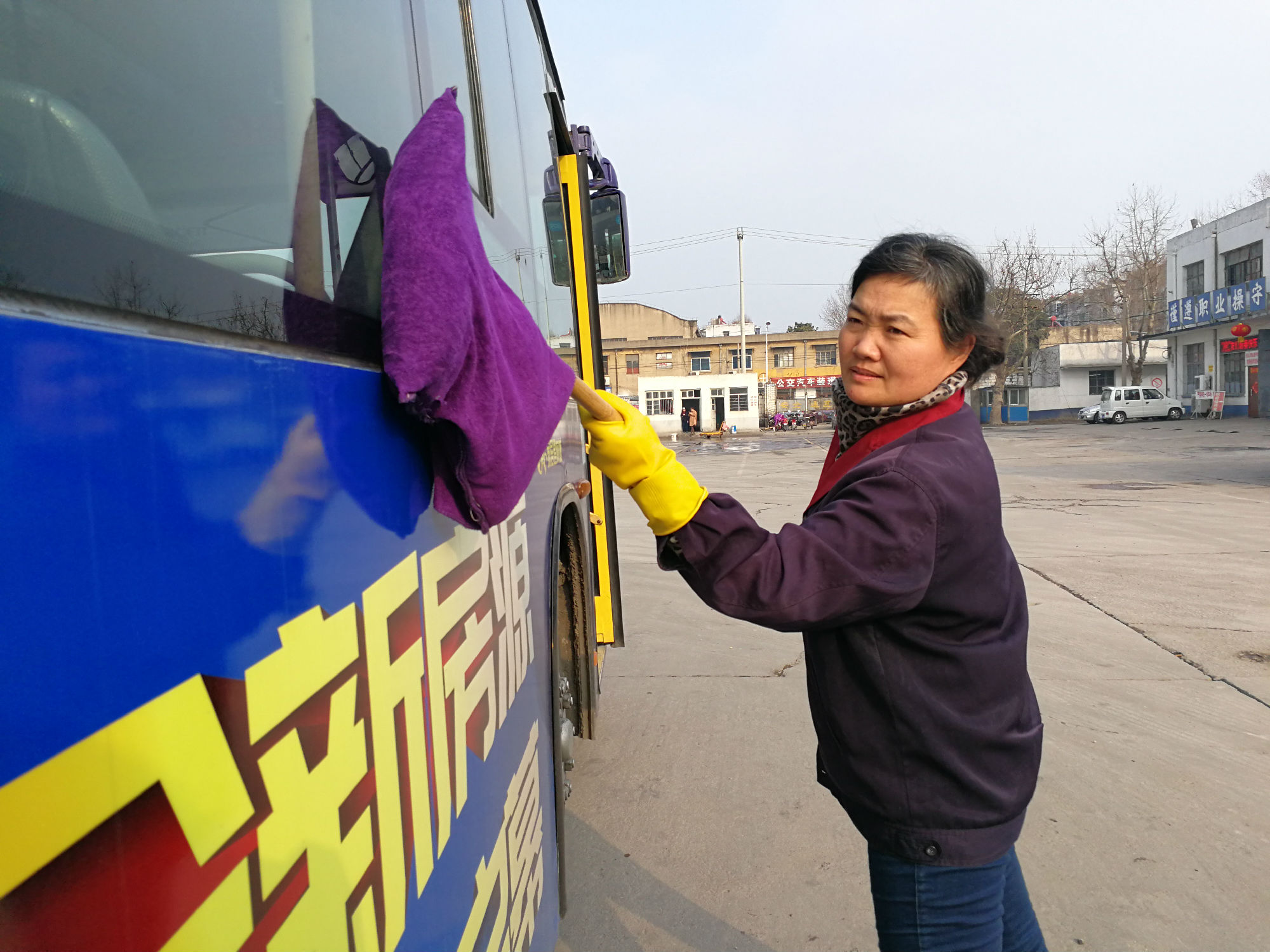清晨5點(diǎn),74路保潔員韓黎明已經(jīng)來到韓山車場,開始保潔車輛。由于氣溫較低,車場內(nèi)的水龍頭凍壞了,無法正常使用,她只好到遠(yuǎn)一點(diǎn)的地方,將水一桶桶的運(yùn)來,開始細(xì)心地擦拭玻璃,車輛外圍,車內(nèi)座椅、內(nèi)圍板....不放過一處角落。冬天的水冰涼刺骨,清洗抹布的手凍得通紅,搓搓手、跺跺腳,她又賣力的干了起來。車窗玻璃上厚厚的霜十分難擦,加上道路上經(jīng)常遇到灑水車,跑完一圈回來車身又臟了,增加了車輛保潔難度。韓黎明不怕辛苦,任勞任怨,只要有臟的地方,她就再次清潔,確保出場的每輛車都干干凈凈。期間,她的衣服多次被汗水浸透,晾晾汗,又凍得發(fā)抖,韓黎明沒有抱怨,仍然堅(jiān)守完成自己的工作。