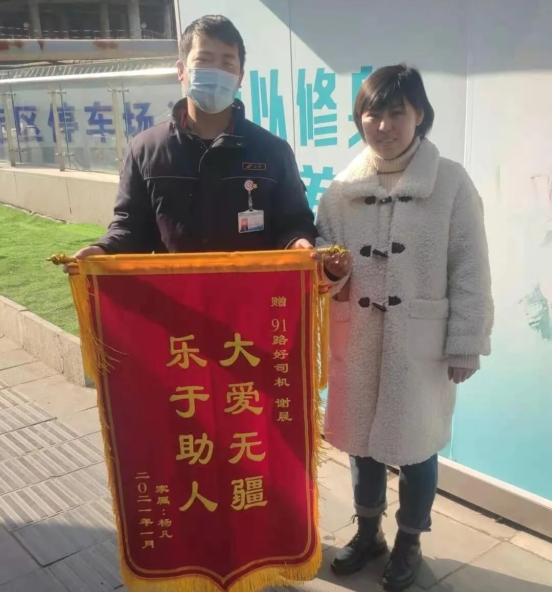 1月18日上午,老人的女兒帶著錦旗來(lái)到了91路車隊(duì)。原來(lái)她媽媽患有阿爾茨海默癥,當(dāng)天是她爸爸帶著媽媽到市中心逛街,一不小心讓媽媽走丟了。在聯(lián)系上謝師傅前,她媽媽已經(jīng)走失近兩個(gè)小時(shí)了。幸虧遇到了好心的公交司機(jī)謝師傅,并一直在調(diào)度室陪著老人。今天她特意來(lái)到車隊(duì)當(dāng)面表示感謝。
