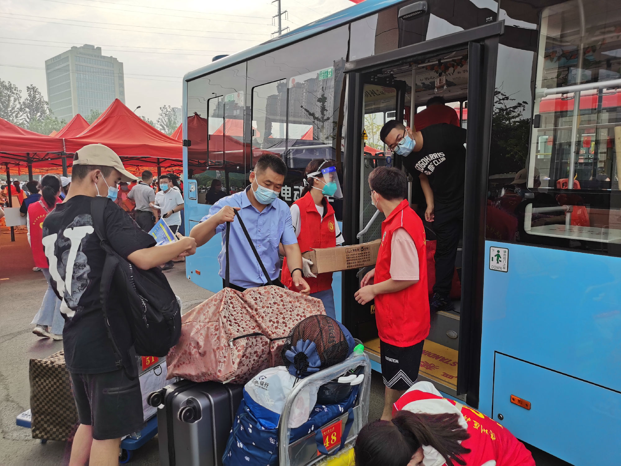 9月23日7時許,城北公司經(jīng)理室?guī)ьI(lǐng)相關(guān)科室人員早早來到學(xué)校待命,提前發(fā)放車頭引導(dǎo)標(biāo)識,并在學(xué)校志愿者的配合下,有序地將新生接送至宿舍樓。考慮到新生進(jìn)校后攜帶行李較多,公司分別在行李集中點(diǎn)、宿舍樓登記點(diǎn)安排管理人員,配合校方維持現(xiàn)場秩序,確保車輛在倒車、行車過程中安全有保障。