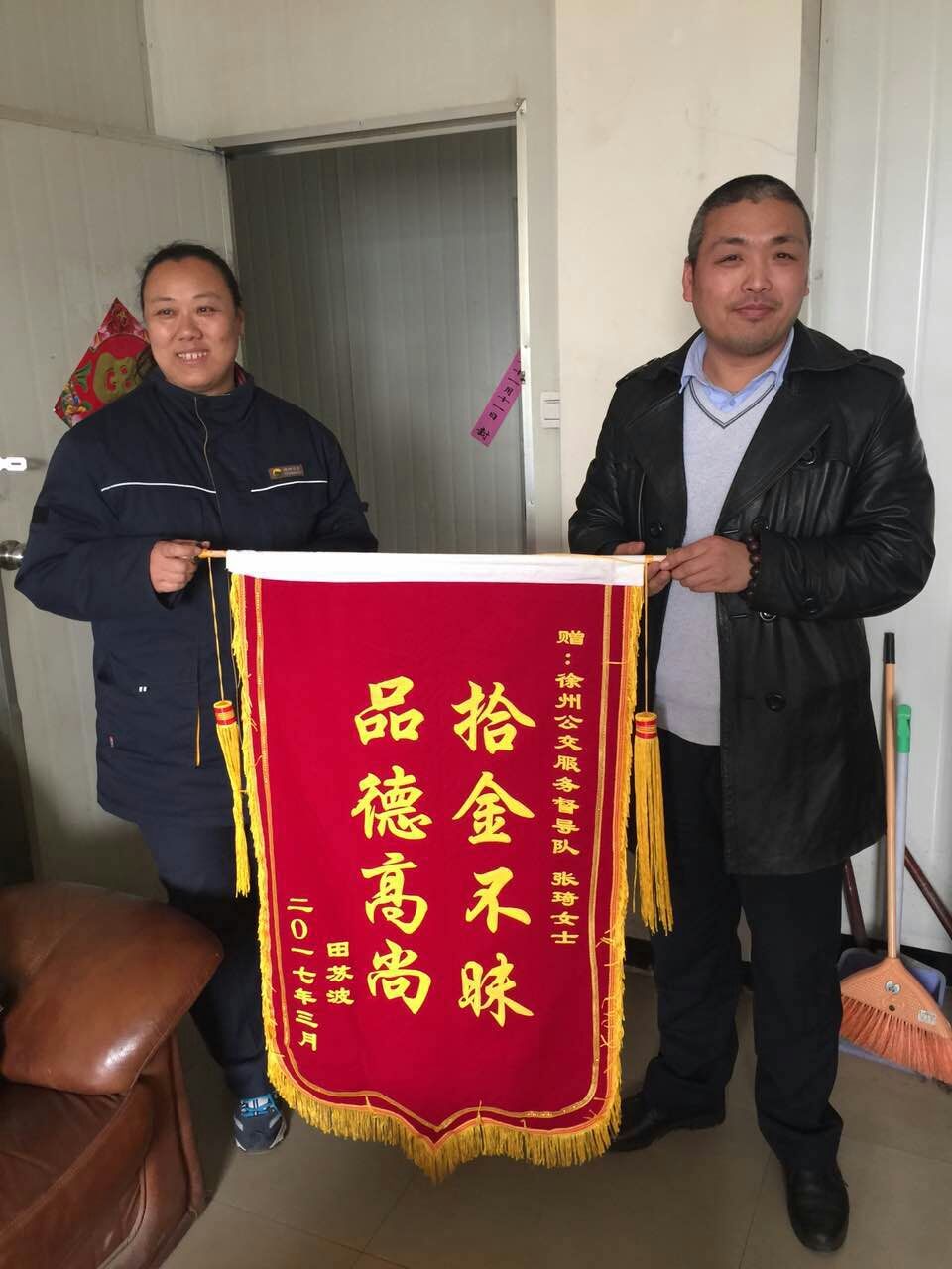 329日,正在站臺執(zhí)勤的督導(dǎo)員張琦撿到乘客掉落的公文包,經(jīng)查看發(fā)現(xiàn)包內(nèi)有蘋果筆記本一臺和一個錢包,但并沒有找到皮包主人的聯(lián)系方式。張琦把包放在了調(diào)度室等待失主來認領(lǐng),約一小時后失主匆忙趕來尋找。失主見到失而復(fù)得的皮包非常激動,經(jīng)過詢問得知失主姓田在徐州礦業(yè)大學(xué)工作。田先生說,“電腦里存有非常重要的資料和聯(lián)系方式,丟包之后萬分焦急,真心感謝公交督導(dǎo)員?!彪S即從錢包里拿出400元錢塞給張琦作為答謝,張琦表示:“路不拾遺本就是自己的義務(wù),作為站臺督導(dǎo)員經(jīng)常會在站臺撿到乘客掉落的物品,不管東西貴重與否我們都會幫失主妥善保管等待認領(lǐng)?!?/span>331日,田先生和他的愛人送來錦旗表示感謝!