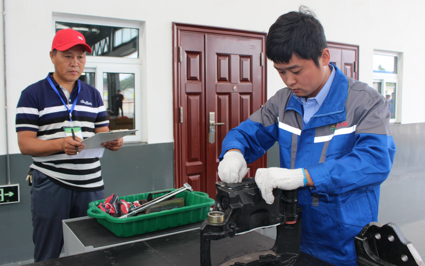 比賽開始了!參賽選手們穿戴整齊的工作服,個個卯足了勁,整裝待發(fā)。整潔的維修車間兩個工作臺上,四組修理人員同時進行盤式制動器拆裝組合的項目比賽,四名裁判員認真對照標準計分,現(xiàn)場安靜得只聽見制動器拆裝時輕微的“啪啪”聲。一旁的4個檢修地溝上,分別停著4輛新能源純電動公交車,同時進行著新能源車電控故障排除項目的比賽。參賽人員時而在駕駛室時而在車廂尾部檢修電路,裁判員根據(jù)實際操作隨機提問、記錄。